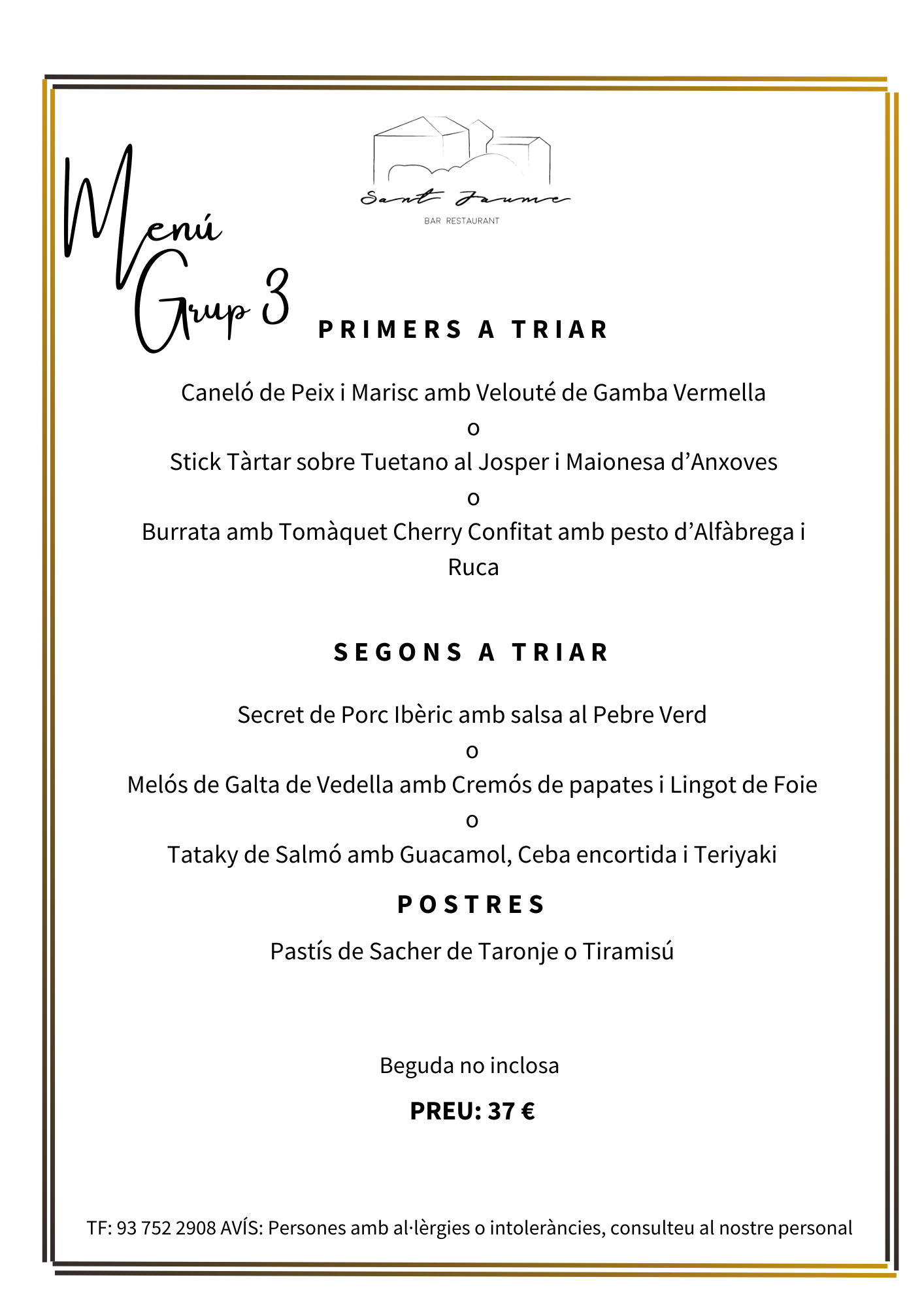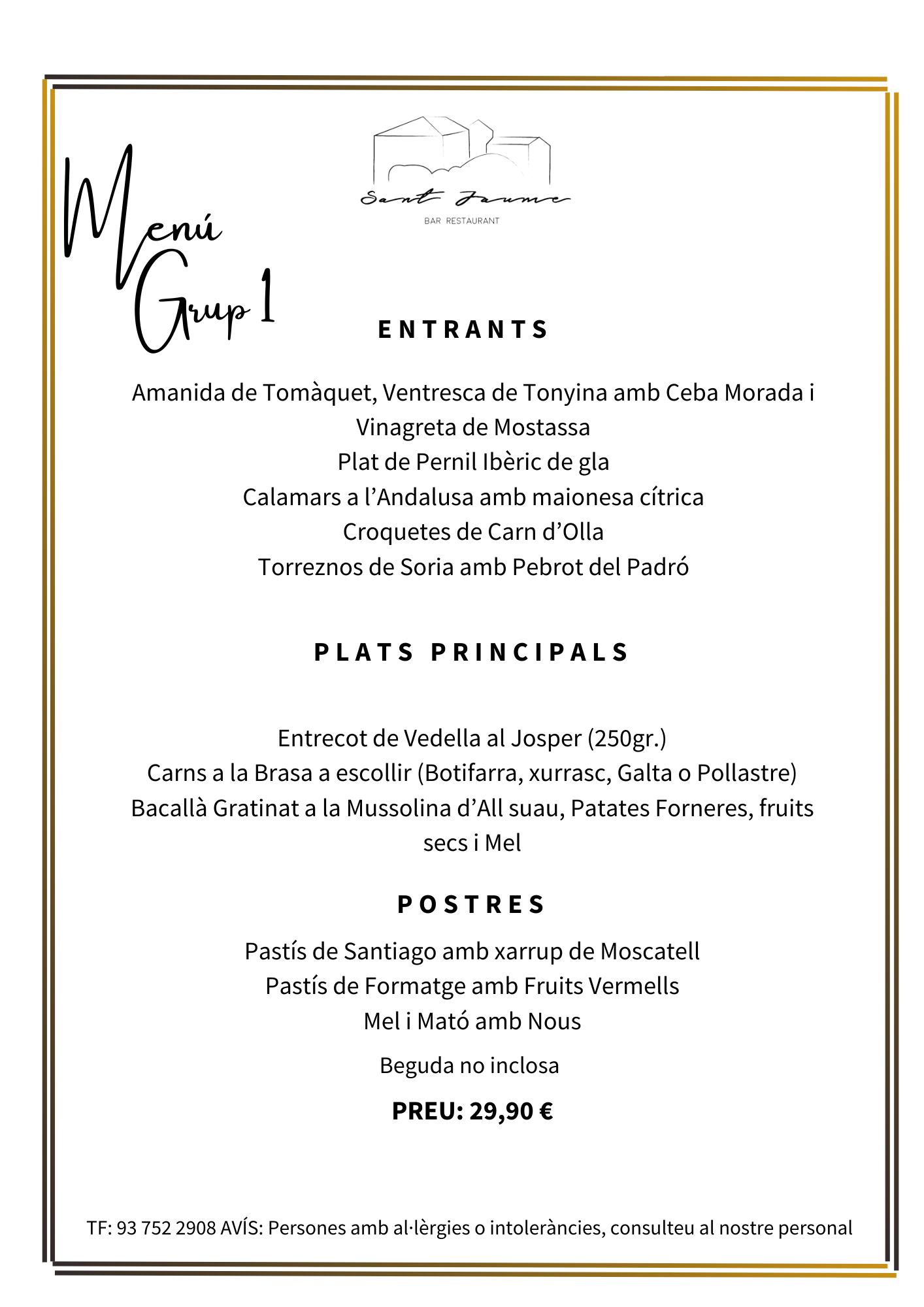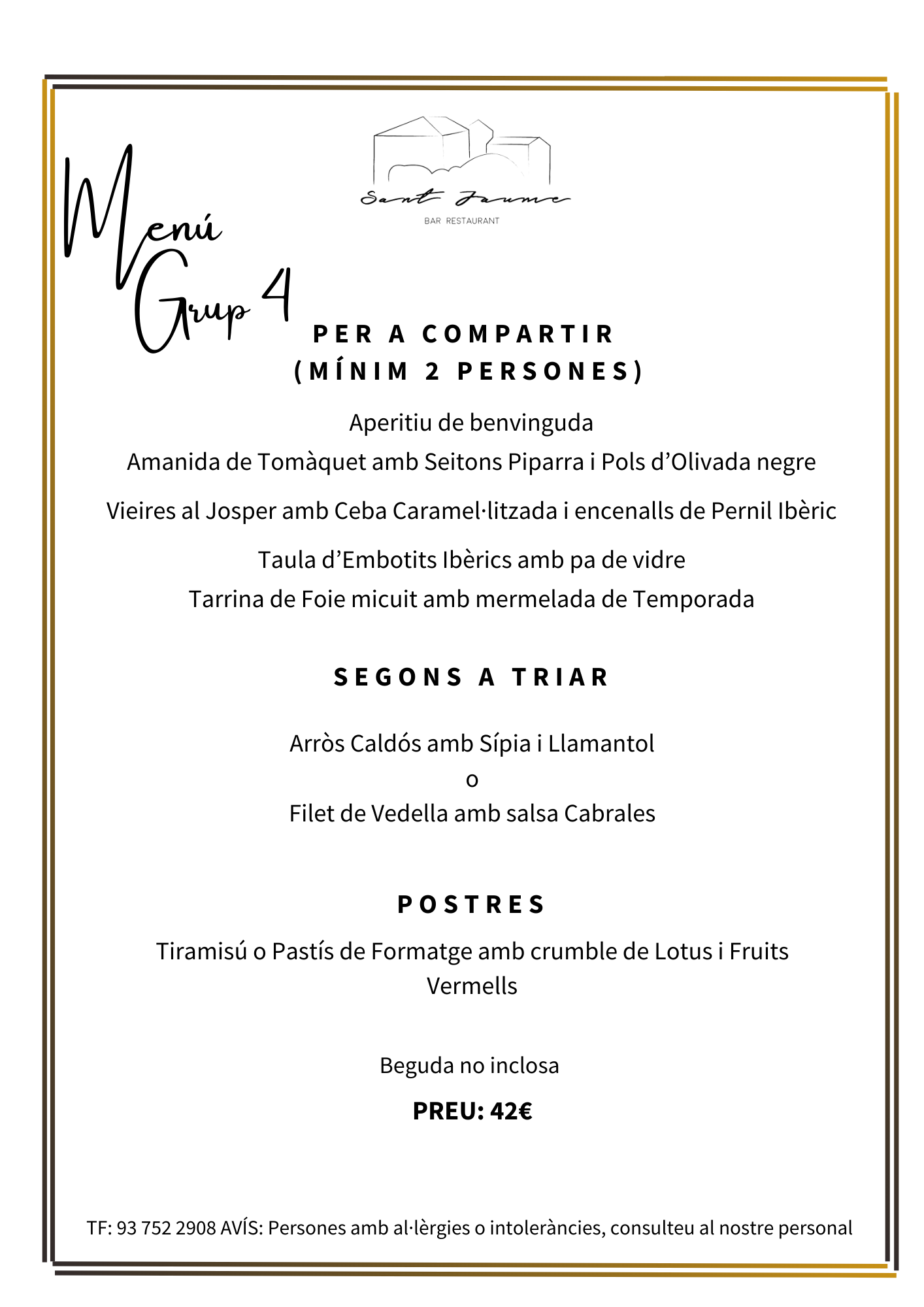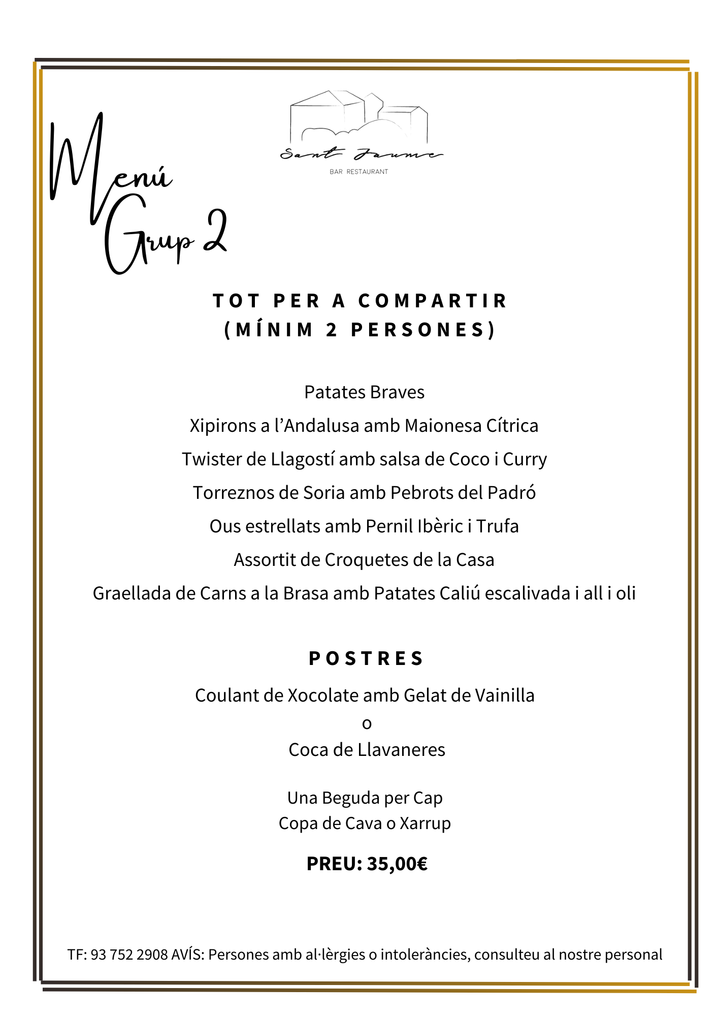 A Sant Jaume, entenem la importància de compartir moments especials amb amics i sers estimats al voltant d’un bon menjar. El nostre menú per a grups ha estat dissenyat per a oferir una experiència culinària excepcional, perfecta per a qualsevol ocasió. Ja sigui una celebració familiar, un esdeveniment corporatiu o simplement una reunió d’amics, som aquí per a crear una experiència gastronòmica memorable.
