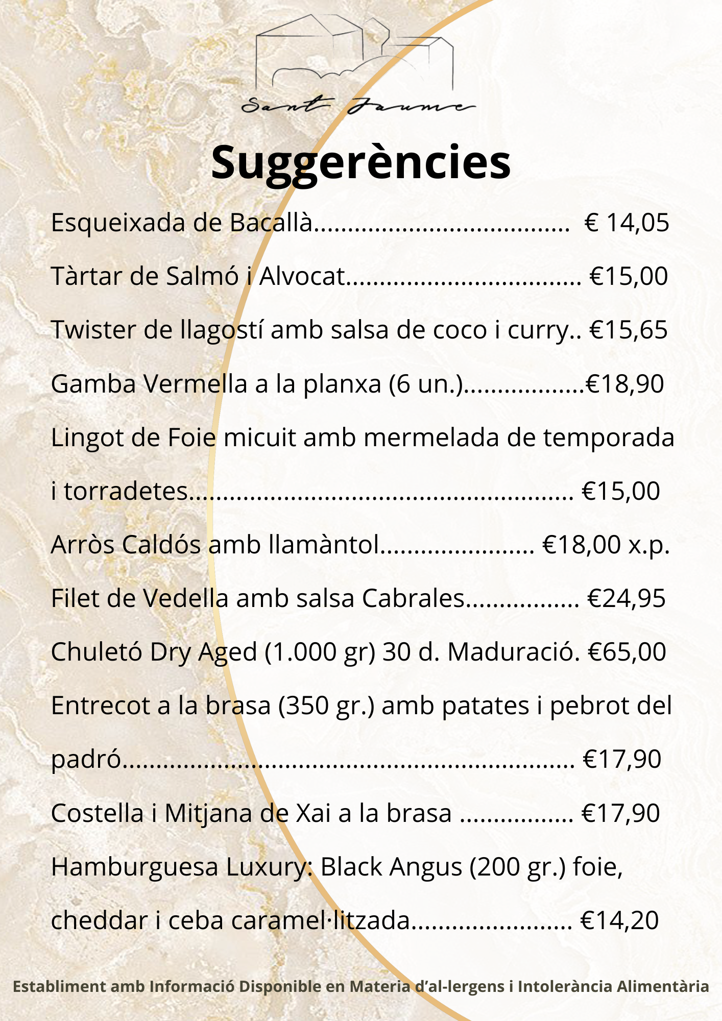 A Sant Jaume us convidem a un emocionant viatge gastronòmic. La nostra carta compta amb una àmplia varietat d’opcions per satisfer tots els paladars. Comença amb entrants frescos i delicioses tapes, després descobreix les nostres llegendàries hamburgueses i una selecció d’entrepans freds i calents.